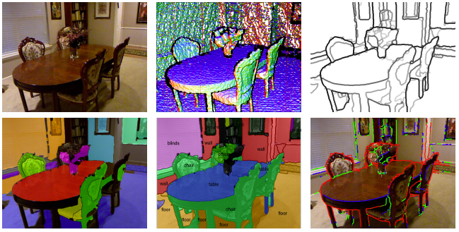 We address the problems of contour detection, bottomup grouping and semantic segmentation using RGB-D data. We focus on the challenging setting of cluttered indoor scenes, and evaluate our approach on the recently introduced NYU-Depth V2 (NYUD2) dataset. We propose algorithms for object boundary detection and hierarchical segmentation that generalize the gPb-ucm approach by making effective use of depth information. We show that our system can label each contour with its type (depth, normal or albedo). We also propose a generic method for long-range amodal completion of surfaces and show its effectiveness in grouping. We then turn to the problem of semantic segmentation and propose a simple approach that classifies superpixels into the 40 dominant object categories in NYUD2. We use both generic and class-specific features to encode the appearance and geometry of objects. We also show how our approach can be used for scene classification, and how this contextual information in turn improves object recognition. In all of these tasks, we report signifi- cant improvements over the state-of-the-art.